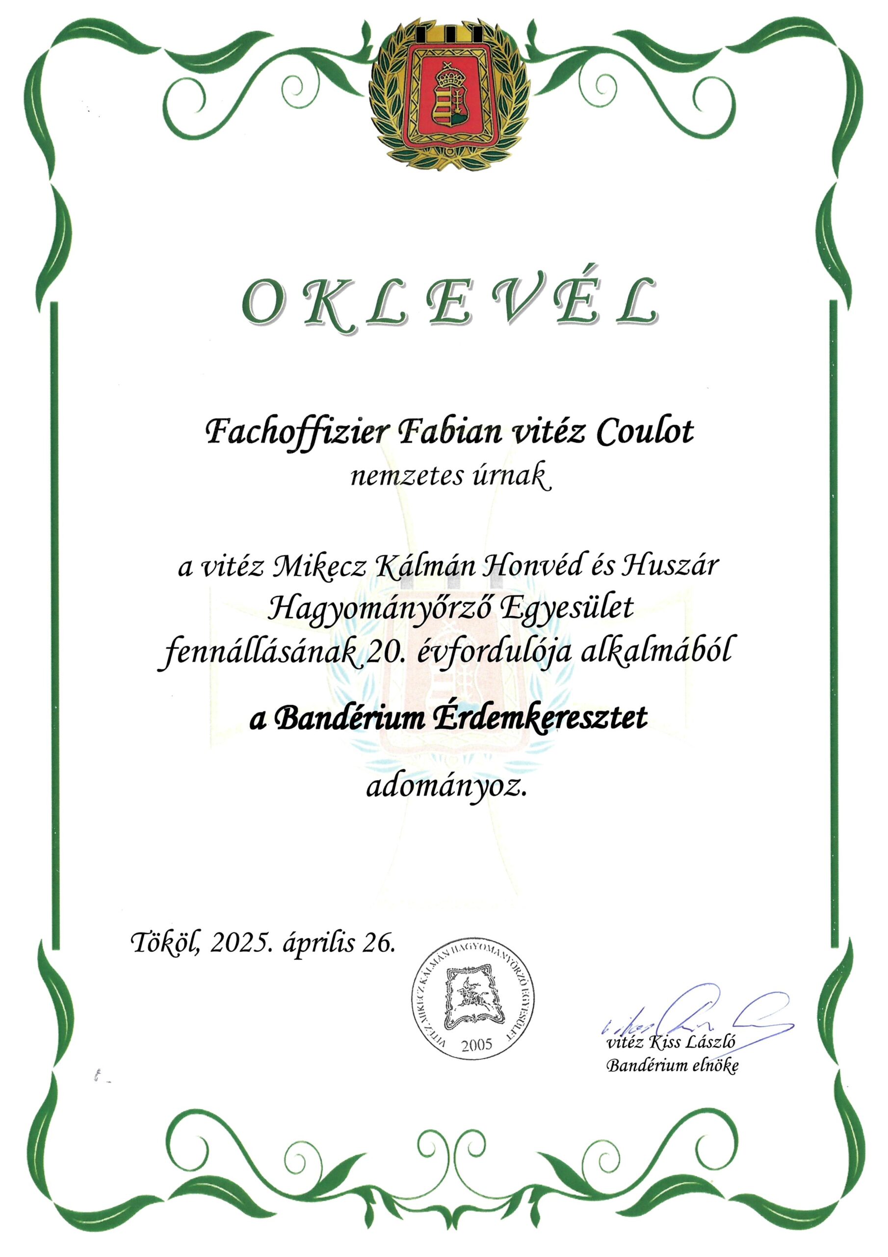 Aktuell / Neu 26.04.2025 Verleihung des Verdienstkreuzes des vitéz Mikecz Kálmán Honvéd und Husaren Traditionsverbandes für 20.-jähriges Jubiläum“Der letzte ungarische Husaren-General“ Urkunde